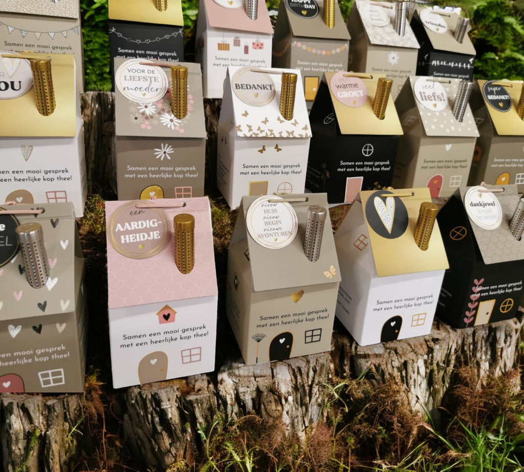 Op zoek naar een origineel cadeau? Met dit theehuisje, waaraan een label met de tekst ‘dankjewel, jij maakt het verschil’ hangt, verwen je de ontvanger met 50 gram heerlijke thee, een doosje met gesprekskaartjes én een thee-infuser in de vorm van een schoorsteen!